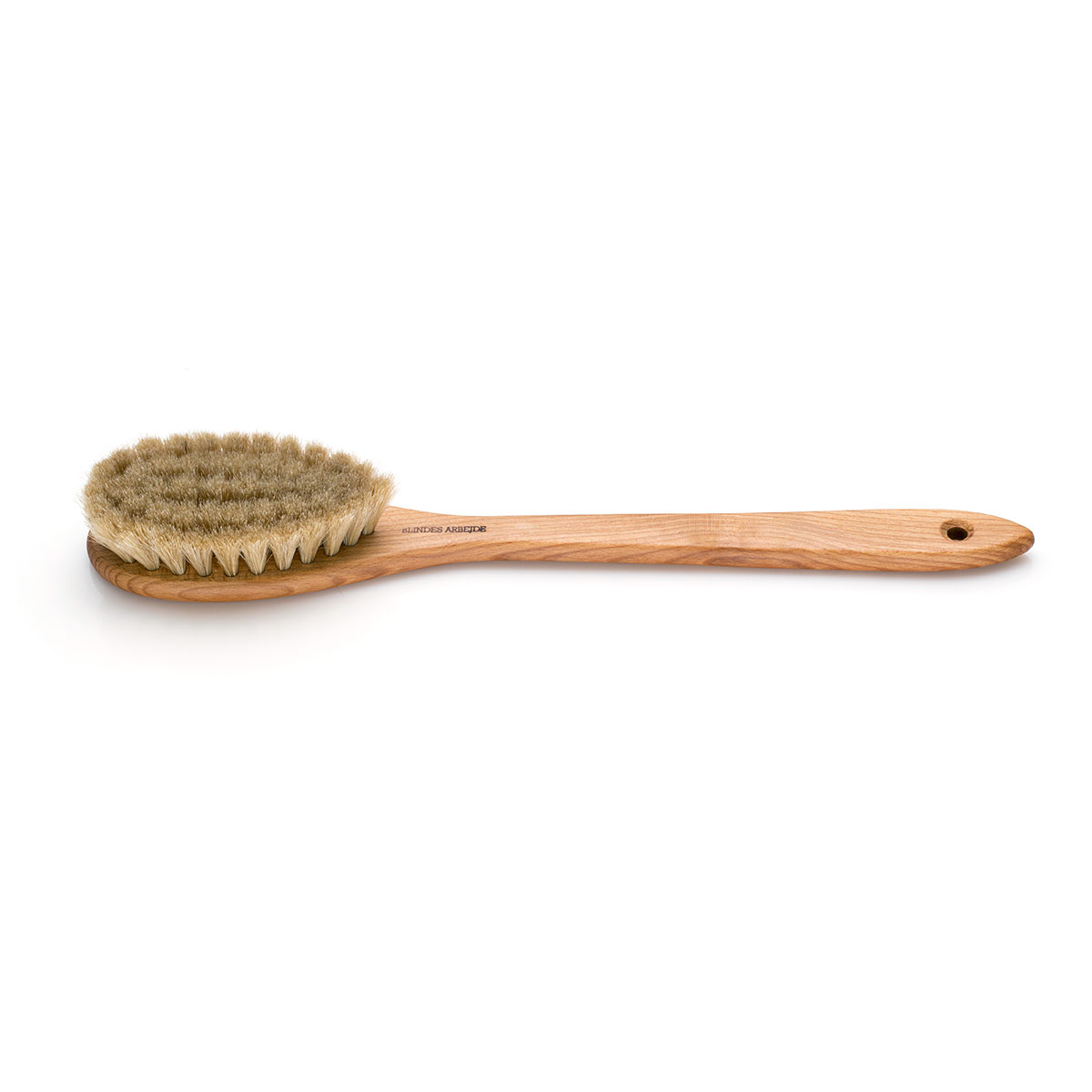 Træet er olieret med linolie men har stadig godt af at tørre ud mellem brug, og vi anbefaler derfor at sætte børsten opret eller at hænge den op efter brug.