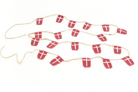 Dannebrog – danske flag i guirlande til at pynte op med i alle anledninger. Guirlanden er med 20 flag og monteret på jutesnor. Flagene er strikket og kan dermed godt vaskes og genbruges mange gange. Genanvendelig og holdbar er en fordel, så man ikke behøver at købe nye flag guirlander hvert år.