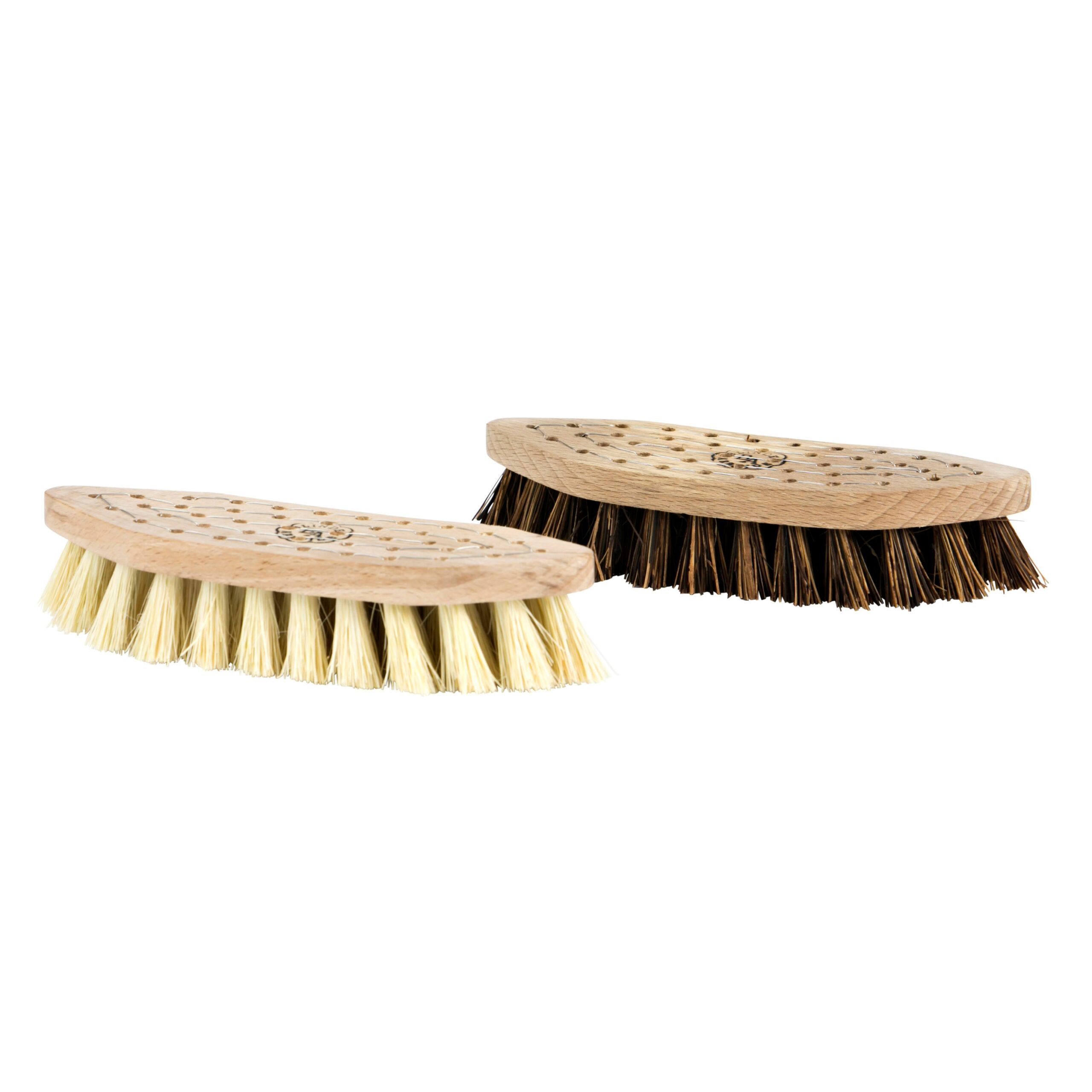 Den klassiske stive skurebørste er med børster af bassine. Arenga er lidt finere og blødere i stråene, mens Mexico fibre (tampico) også er bløde og har en polerende effekt.